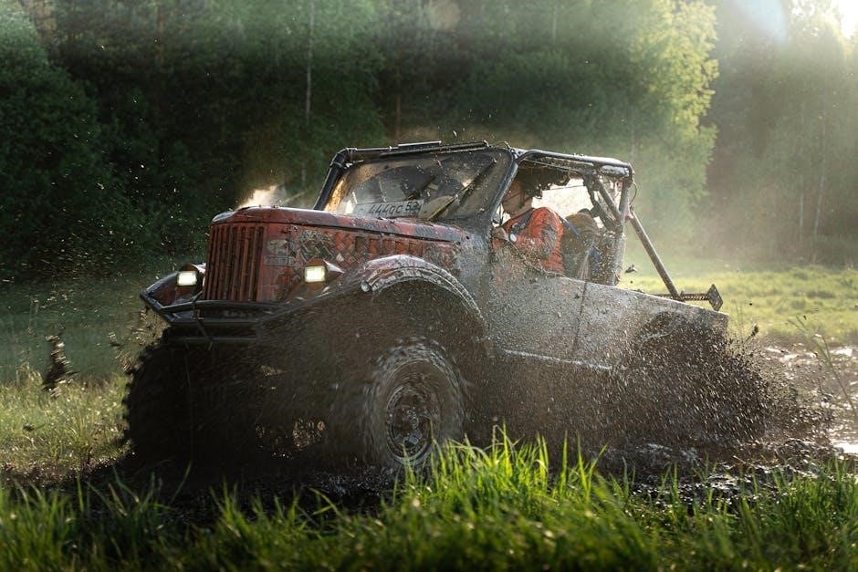Always wear seatbelts and ensure all passengers do the same before off-road adventures. Use the four-wheel-drive system appropriately for terrain conditions. Avoid sudden maneuvers and maintain a safe speed. Check surroundings before climbing steep inclines or descending. Never overload the vehicle beyond its capacity. Keep emergency tools and supplies on hand. Familiarize yourself with the vehicle’s limits to ensure a safe and enjoyable off-road experience.